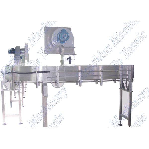 air convey connect bottle blowing machine with filling machine. Air conveyor can convey empty bottles efficiently and stably. The air conveying channel is supported by foot stand on the ground. Fans are furnished in upper part of air conveying channel. Each air inlet of those fans is equipped with an air filter to prevent dusts from entering into bottles. Necks of bottles are stuck by bottle hanging plate in air conveyor channel, and then those bottles are sent by wind force to rinsing filling capping machine.